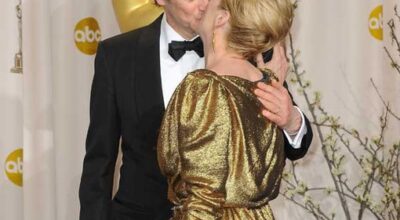 La protagonista de "La dama de hierro", Meryl Streep, besa a su oscarizado compañero, Colin Firth.