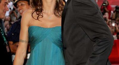 La modelo italiana Elisabetta Canalis recibe un beso de su entonces novio, George Clooney.