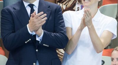 Los príncipes Alberto y Charlene animan en el centro acuático.
