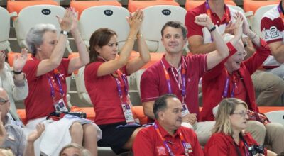 La familia real danesa en la competición de natación, muy atentos a todo lo que ocurre.