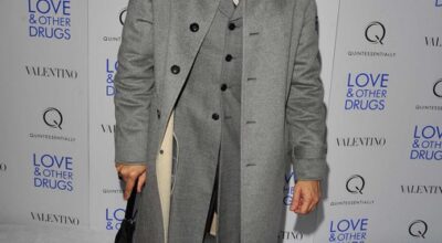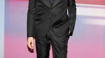 Eddie Redmayne con traje en gris oscuro.