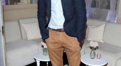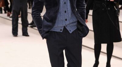 Eddie Redmayne con pantalones en camel y chaqueta azul.
