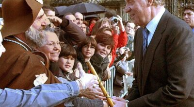 Juan Carlos saluda a un peregrino en una ceremonia religiosa celebrada en la Catedral de Santiago de Compostela en diciembre de 2003.