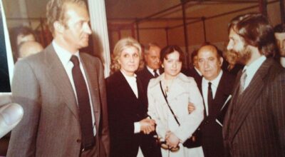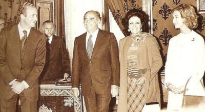 El rey Don Juan Carlos de Borbón y su esposa, la reina Doña Sofía de Grecia, junto a JOLOPO y Carmen Romano, en el año 1977.