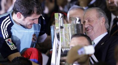 Juan Carlos, gran aficionado de todos los deportes, saluda a Iker Casillas, portero del Real Madrid, y le felicita por el trofeo recibido.