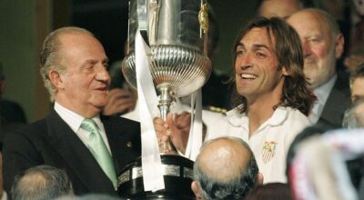 Juan Carlos Junato a Javi Navarro, capitán del Sevilla, en la final de la Copa del Rey de fútbol.
