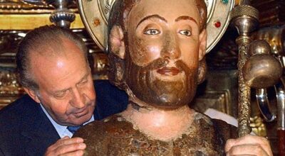 Juan Carlos besa la estatua de San Santiago en una ceremonia religiosa en la catedral de la capital compostelana.