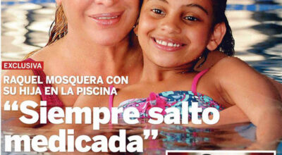 Raquel Mosquera está triunfando gracias a el programa televisivo de los trampolines y en una entrevista exclusiva con la revista, la viuda de Pedro Carrasco posa con su hija en la piscina y declara: "Siempre salto medicada".