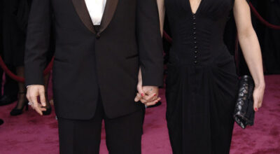 El actor, aunque algo despeinado, acierta con este traje de chaqueta en negro y camisa en blanco. La mano de la que fue su mujer parecía que ayudaba.