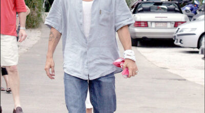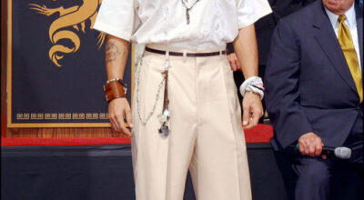 El actor apareció con estas pintas al estreno de la película Blow. Falla en peluquería, en vestimenta y en elegancia.