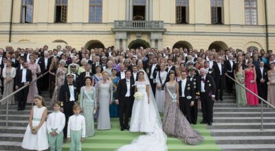 Los novios posan junto a todos los invitados en las escaleras del Palacio de Drottningholm.