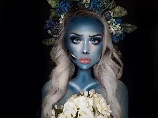 La novia cadáver es otro disfraz que nunca falla. Para conseguir el look lo único que necesitas es pintar tu rostro con pintura en crema blanca o azul. Lo único que faltaría es dar volumen al rostro con alguna sombra azul más oscura y pintar los labios con un color fuerte, como un rojo pasión, para conseguir ese aspecto de dibujo.