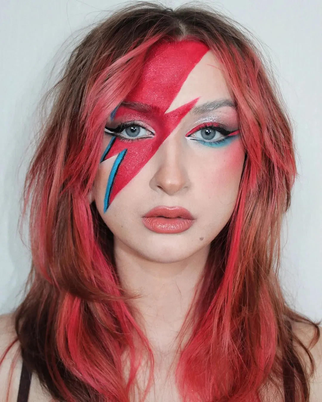 En Halloween todo vale. Y ¿qué mejor que continuar con otro clásico? El Relámpago de «Aladdin Sane» es probablemente el maquillaje más famoso de David Bowie y uno de los más replicados en la historia del rock.