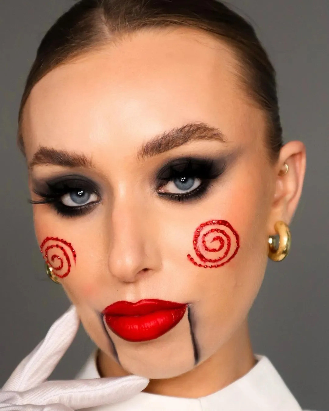 Para disfrazaros de uno de los personajes más sádicos e inteligentes, a parte de la ropa, necesitas un maquillaje convincente. Sobre una base blanca, dibuja en forma de espiral unos coloretes de color rojo fuerte. Pinta tus labios del mismo color y de las comisuras a la barbilla tira unas líneas negras. Para acabar, ennegrece tus ojos y trata de pintar el centro con tonalidades rojizas.
