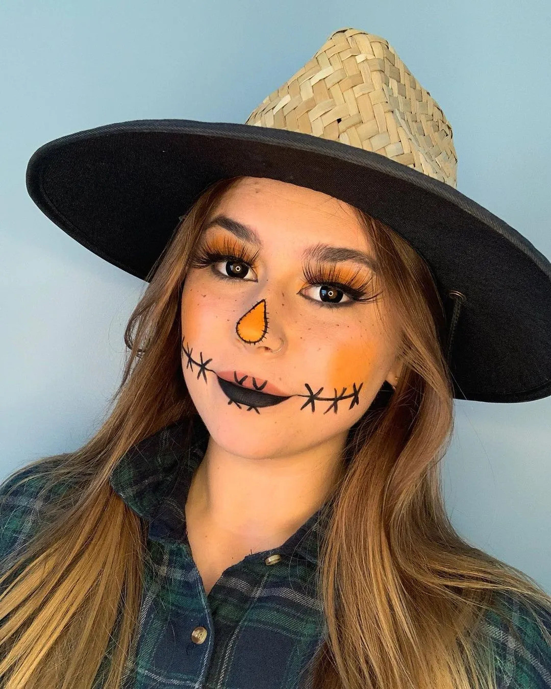 Este maquillaje de espantapájaros del terror es otra de las propuestas que nos han fascinado. Se trata de un maquillaje sencillo a base de naranjas y el clásico