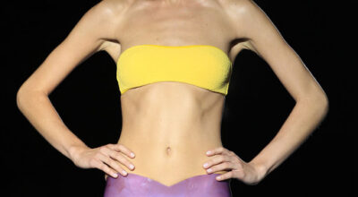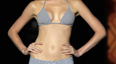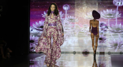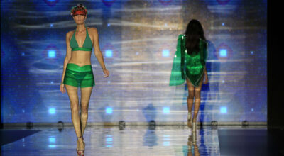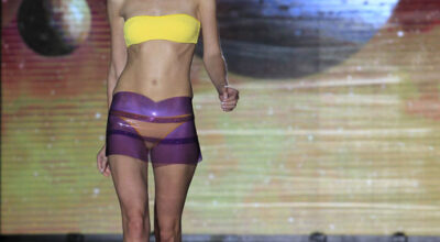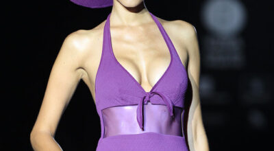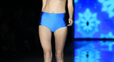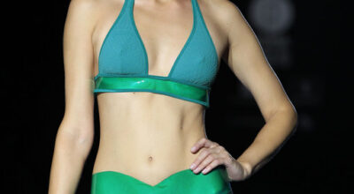 Biquinis de jacqards y vichys, y bañadores de piqué en tonos amarillos y morados son la apuesta de la firma catalana, aunque también pudimos ver estampados de flores, tocados de vinilo, realizados por los sombrereros vallisoletanos Pablo y Mayaya, pareos y camisolas. Las rayas marineras en blanco y negro también adquirieron su protagonismo entre sus diseños.