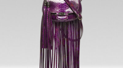 Este diseño firmado por Gucci en pitón púrpura incorpora flecos, borlas y detalles de bambú cosidos a mano.