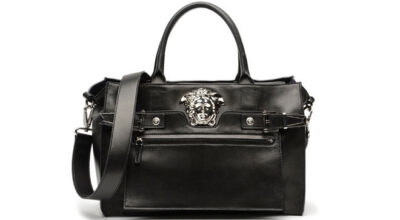 Donatella Versace sabe bien cómo crear accesorios con un toque rockero, y así sucede con este diseño en napa negra.