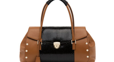 Trussardi da otra vuelta de tuerca con este bolso de mano en piel marrón con añadido de pitón en la parte central.