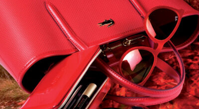 Bolso ‘Chantaco’ Lacoste, gafas ‘chris’ terciopelo rojo lente espejo Ray-ban. Paleta de Maquillaje Clarins, esmalte Le Vernis Chanel y barra labios Color Elixir tono Signature Scarlet Maybelline.