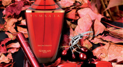 Coche Macchinine, broche oro blanco y diamantes con rubíes africanos Isidoro Hernández Joyero. Eau de Toilette Samsara Guerlain y Concentrado Alisador Antiarrugas Instantáneo Clarins.