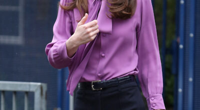 En la visita de Kate al Centro Infantil Henry Fawcett en Londres, la duquesa llevaba un pantalón Marlene y una encantadora camisa Gucci lavanda, cuyos botones no se ajustaban al protocolo real.
