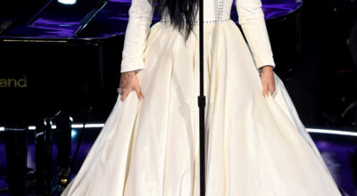 Demi Lovato con un hermoso vestido blanco en el escenario.