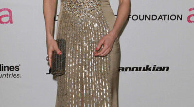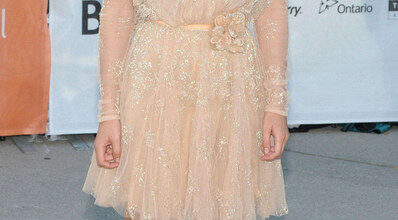 La actriz está bellísima con este vestido dorado pero de corte romántico de la firma Ellie Saab.