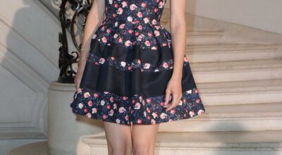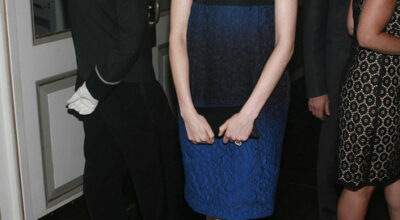 Marion Cotillard con vestido ajustado en azul. Es muy fan de los vestidos a media pierna