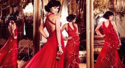 Mes de Diciembre. Penélope Cruz con vestido de Monique L'huillier, zapatos de Salvatore Ferragamo y anillo de platino de Molina Cuevas. La bebida es un Campari Orange y Campari Bottle