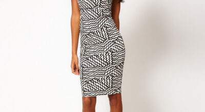 Vestido ajustado a media pierna con estampado y hombros descubiertos