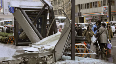 Una parada de autobús destruida por el derrumbe de un inmueble, en Sendai.