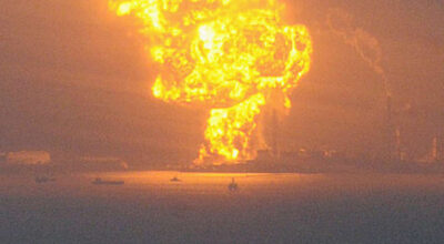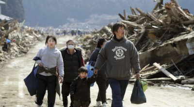 Una familia camina entre los escombros en Minami Sariku, cuyo antiguo paisaje paradisíaco se ha convertido en un infierno.