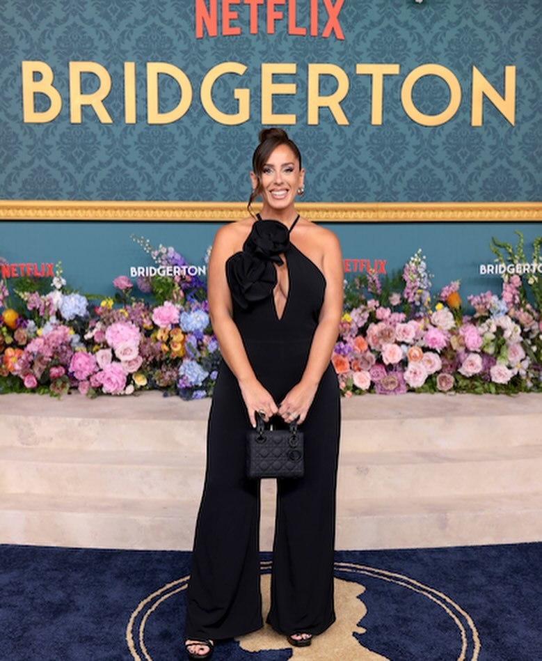 Durante su viaje a Estados Unidos para atender la premier de Los Bridgerton, lució un mono en tono oscuro que no rodeaba totalmente su cuerpo, una decisión acertada para no revelar su estado de embarazo. Además, con sus movimientos cuidadosos y poses durante el evento, tal y como taparse la barriga con las manos, logró que su estado pase desapercibido al ojo público.