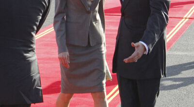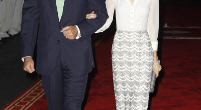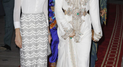 De un look gris, sobrio y digno de una oficinista a un look impoluto y majestuoso que le hizo brillar con luz propia. Así han sido los dos nuevos estilismos que su Majestad la reina Doña Letizia ha lucido en su último viaje a Marruecos. Acompañada en todo momento de Don Felipe, la recién estrenada reina bajaba del avión poco después de las cinco de la tarde con un traje de chaqueta y falda por la rodilla en gris firmado por Hugo Boss. Un outfit demasiado oscuro para un país que ayer sufría temperaturas cercanas a los 35º.