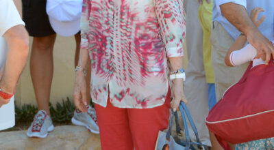 Allí, pudimos verla luciendo un complemento de lo más familiar que asombró y agradó a los numerosos medios que ansiaban la llegada a la isla de parte de la familia Borbón. El complemento en cuestión era un bolso en tono azul cielo y crema que llevaba impreso en un lateral la cara de sus cuatro nietos y en el lateral opuesto, la de sus cuatro nietas, que sorprendió a críticos de moda y estilo. «¡Qué horterada!», se escucha todavía en la redacción de moda y belleza.