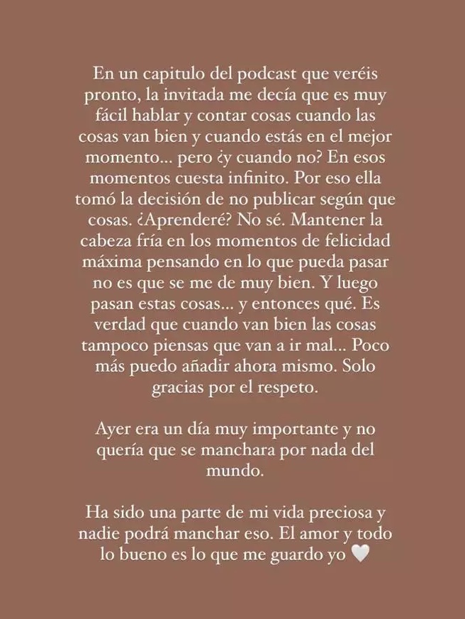 Dos días antes de este “stories” publicaba otro en el que confirmaba la ruptura de manera oficial y mucho más seria: «es muy fácil hablar y contar cosas cuando las cosas van bien y cuando estás en el mejor momento”,»ha sido una parte de mi vida preciosa y nadie podrá manchar eso. El amor y todo lo bueno es lo que me guardo yo”, escribía en un mensaje para destacar que se quedaba con los buenos momentos que habían vivido juntos.