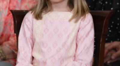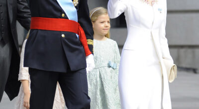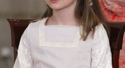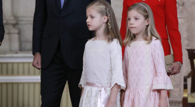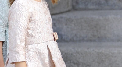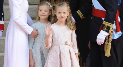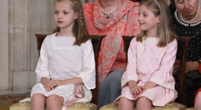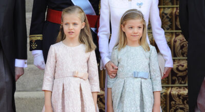 Las pequeñas Leonor y Sofía han sido otro de los centros de atención al brillar con el mismo vestido de la firma Pili Carrera en seda natural brocada con manga francesa y lazos zapatero pero en diferente color: la princesa en maquillaje y la infanta en verde empolvado. En el pelo, Leonor ha lucido un semi recogido con trenza lateral mientras que la infanta Sofía lucía una pequeña diadema.