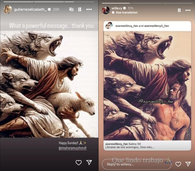 El pasado 28 de abril la pareja de actores han coincidido al publicar una imagen religiosa en sus cuentas de Instagram, lo cual hace pensar que lleva algún doble sentido. La primera en publicar la imagen fue Elizabeth Gutiérrez. En ella se ve una manada de lobos atacando a Jesucristo, el cual a su vez trata de proteger un cordero blanco. La imagen iba acompañada de un mensaje: “Que mensaje tan poderoso”.