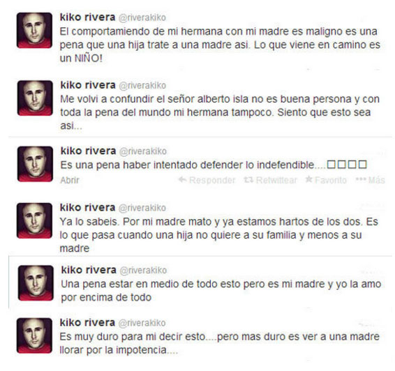 A eso de las 8 de la tarde la cuenta de Kiko Rivera en Twitter comenzó a enviar varios tweets en los que criticaba duramente a su hermana y a su cuñado, Alberto Isla, en los que, además, reventaba una posible exclusiva confesando el sexo del bebé que podría esperar la pequeña Isabel: "Lo que viene en camino es un NIÑO", señalaba el DJ. Hoy, y ya borrados todos los tweets, se defiende diciendo que alguien le hackeo la cuenta y que jamás haría algo así contra "sus dos Isabeles".
