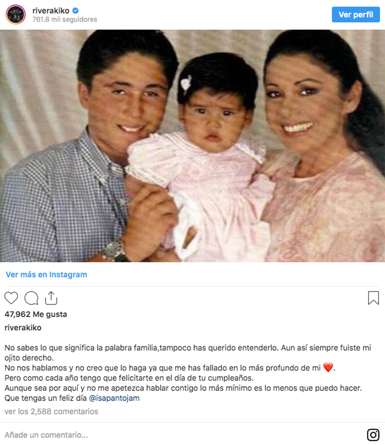 «No sabes lo que significa la palabra familia, tampoco has querido entenderlo. Aun así siempre fuiste mi ojito derecho. No nos hablamos y no creo que lo haga, ya que me has fallado en lo más profundo de mi corazón. No obstante, quiero felicitarte como cada año, aunque sea por aquí y no me apetezca hablar contigo lo más mínimo, es lo menos que puedo hacer. Que tengas un feliz día, Isa Pantoja«.