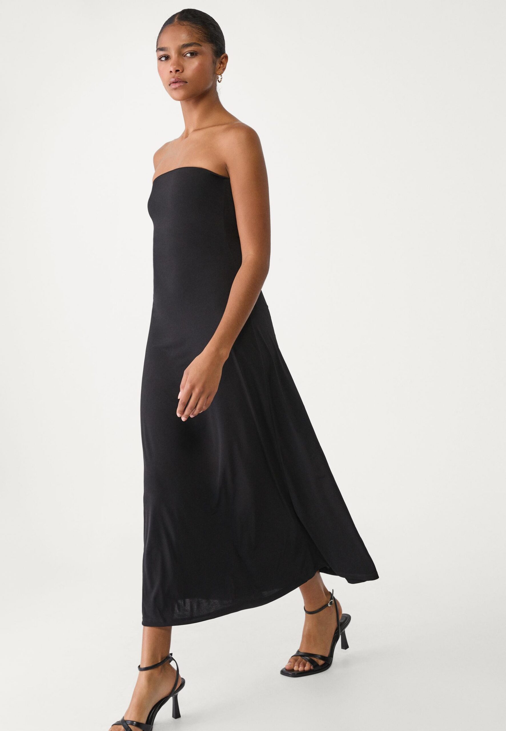 Navegando a través de internet, hemos encontrado un clon low cost de la mano de Stradivarius, que podría simular perfectamente el look de Letizia. Se trata de un vestido midi evasé con hombros descubiertos, escote recto y silueta fluida. ¿Lo mejor? Está disponible en negro y otros colores… ¡Y solo por 16 euros! REF: 2409/426/001.