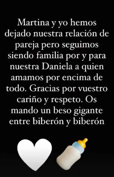 Casado nos sorprendía con una publicación en sus stories de Instagram que decía: «Martina y yo hemos dejado nuestra relación de pareja, pero seguimos siendo familia por y para nuestra Daniela, a quien amamos por encima de todo”, dejando claro que seguirán unidas por la pequeña y que no hay mala relación entre ellas. Además añadía un “Gracias por vuestro cariño y respeto. Os mando un beso gigante entre biberón y biberón”.