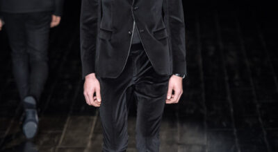 La opción de Gucci también cae rendida ante los pies del terciopelo, aunque por supuesto, el novio debería combinarlo con camisa blanca o gris, en lugar de seguir al pie de la letra el look total black de pasarela.
