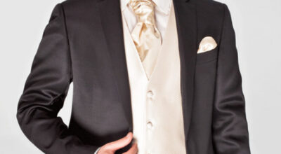 Volvemos a girar la rueda, pues si quieres que tu novio apueste por una opción segura y tradicional, lo mejor será un traje oscuro combinado con chaleco y corbata en color crema, como éste de Protocolo.