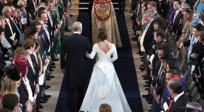 La princesa Eugenia de York -hija del príncipe Andrew y Sara Ferguson y prima de Harry y Williams- renunció a llevar velo y eligió una tiara poco convencional que combinaba a la perfección con su vestido de novia con doble escote en ''V'', manga larga y falda abullonada de cola, obra de los diseñadores Peter Pilotto y Christopher De Vos, fundadores de la firma Peter Pilotto en 2007. Un vestido que, según sus creadores, fue el resultado del estudio de los diseños que llevaron antes otras novias de la Familia Real, combinados con las peticiones de la Princesa, que trabajó con ellos en su taller de Londres. Pero en esta boda real poco convencional, Eugenia quiso mantener viva una de las tradiciones familiares, la que tiene lugar al día siguiente de la boda y es que, siguiendo la costumbre de las novias Windsor, Eugenia depositó el pasado sábado su ramo en la Tumba del Soldado Desconocido, que se encuentra en la Abadía de Westminster.