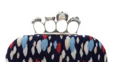 Para las madrinas más atrevidas BDBA propone este bolso de mano tan peculiar con estampado en colores azul, blanco y rojo y con asa a modo de sortijas. Dos complementos en uno por 123€.