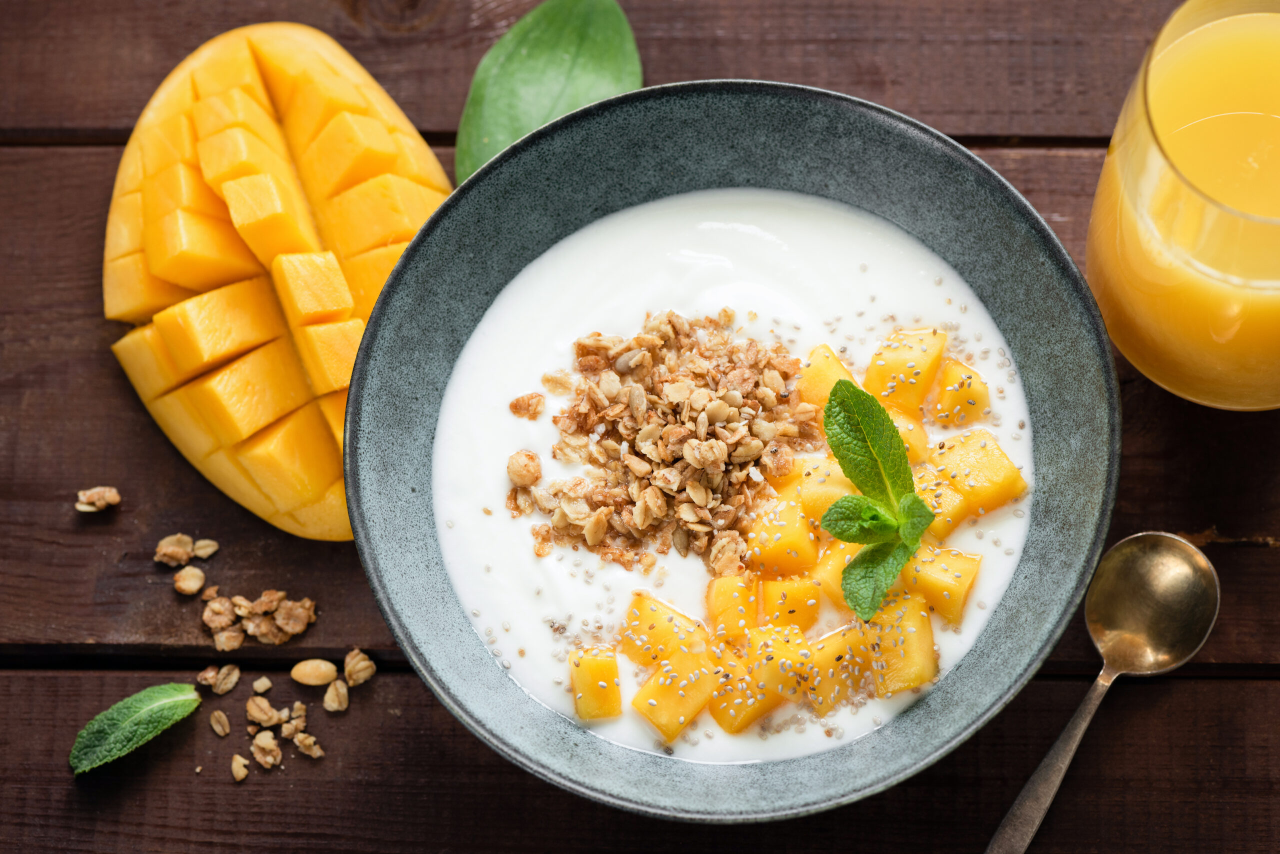 Mezcla el yogur o la leche con las semllas de chía y reposa la mezcla por media hora. Puedes también prepararlo una noche anterior y dejarlo en la nevera. Agrega el mango rebanado y, por último, la granola. ¡Tu snack está listo!