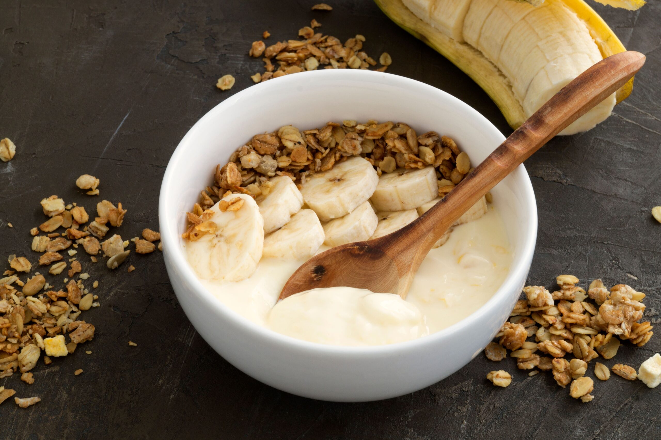Bate el yogur y el plátano, mezcla algunas gotas de esencia de vainilla y decora con la granola. Como opción, puedes también agregar frutos rojos o cacao en polvo. ¡Así de fácil!