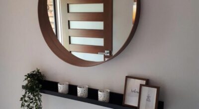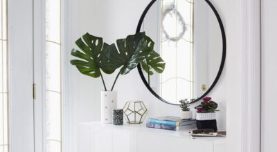 1. Decora tu entrada con un espejo redondo como protagonista